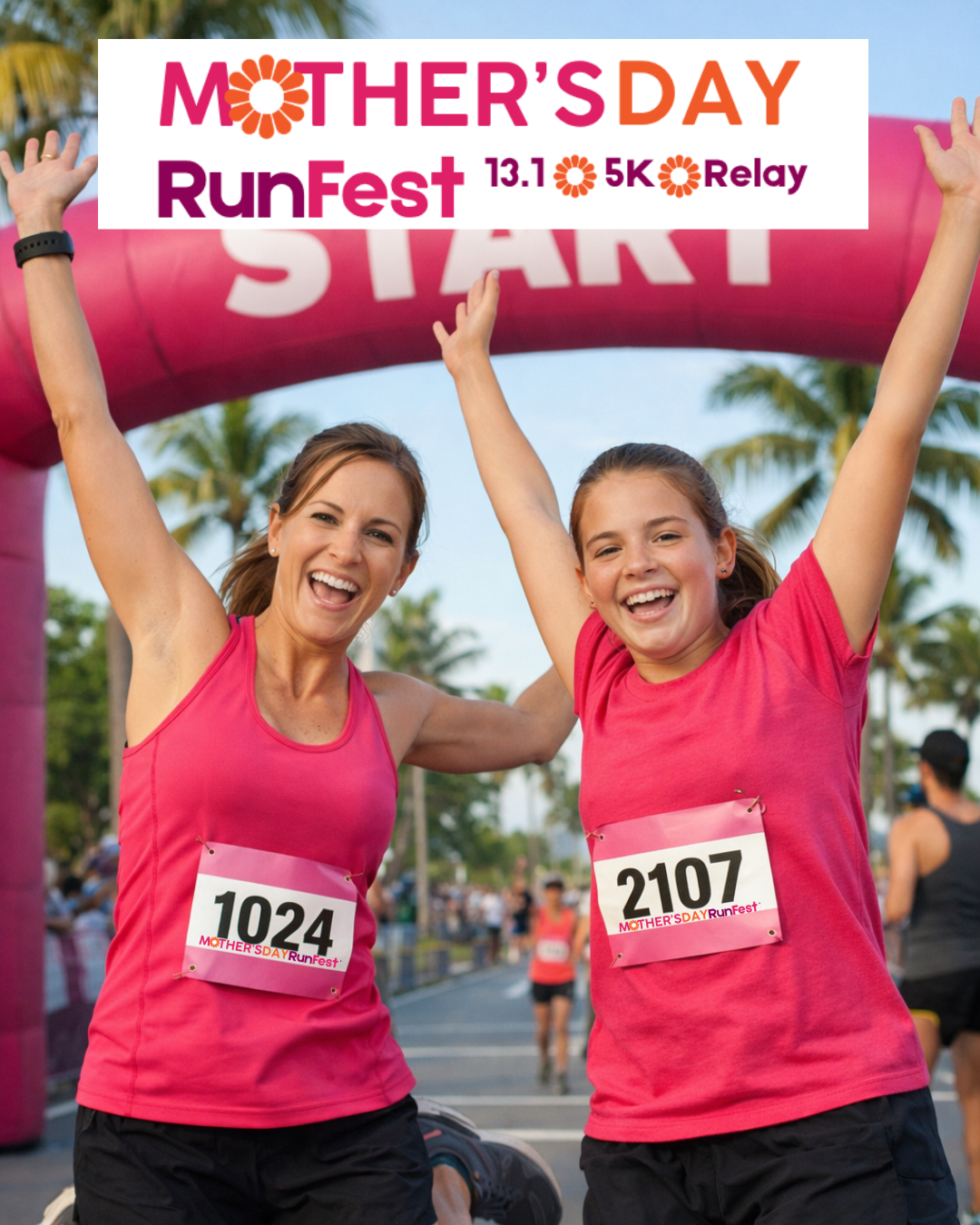 Please come join us on Saturday, May 9th to kick off a weekend celebrating Moms! We will have fast and flat 13.1, as well as a 5K and 13.1 2 person relay through John Prince Park in Lake Worth. Don't miss the post-race party featuring flowers for all Moms along with their medal! We also have a post-race brunch available for purchase!